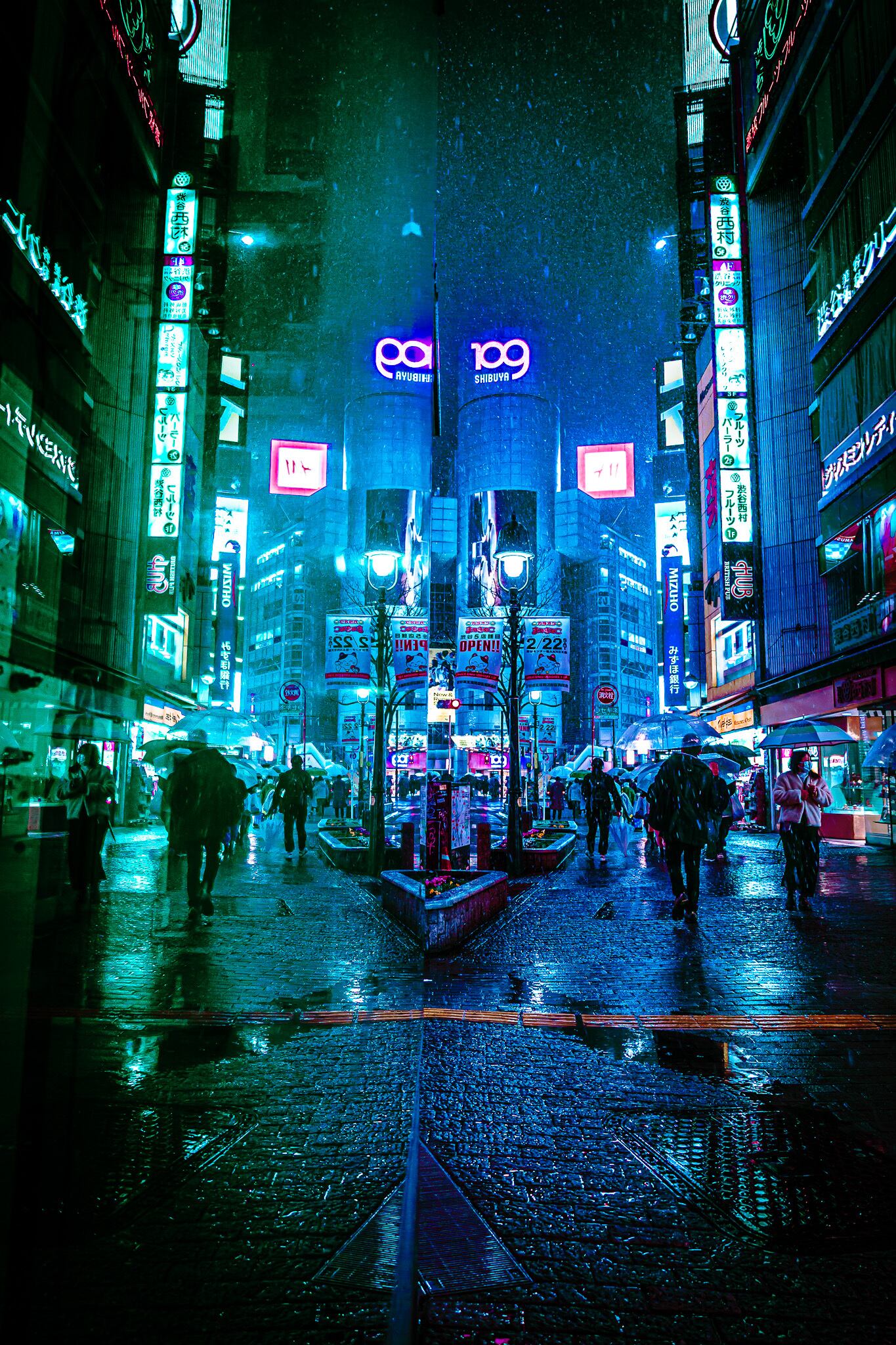 This photo was taken in front of Shibuya 109 on a rainy night.