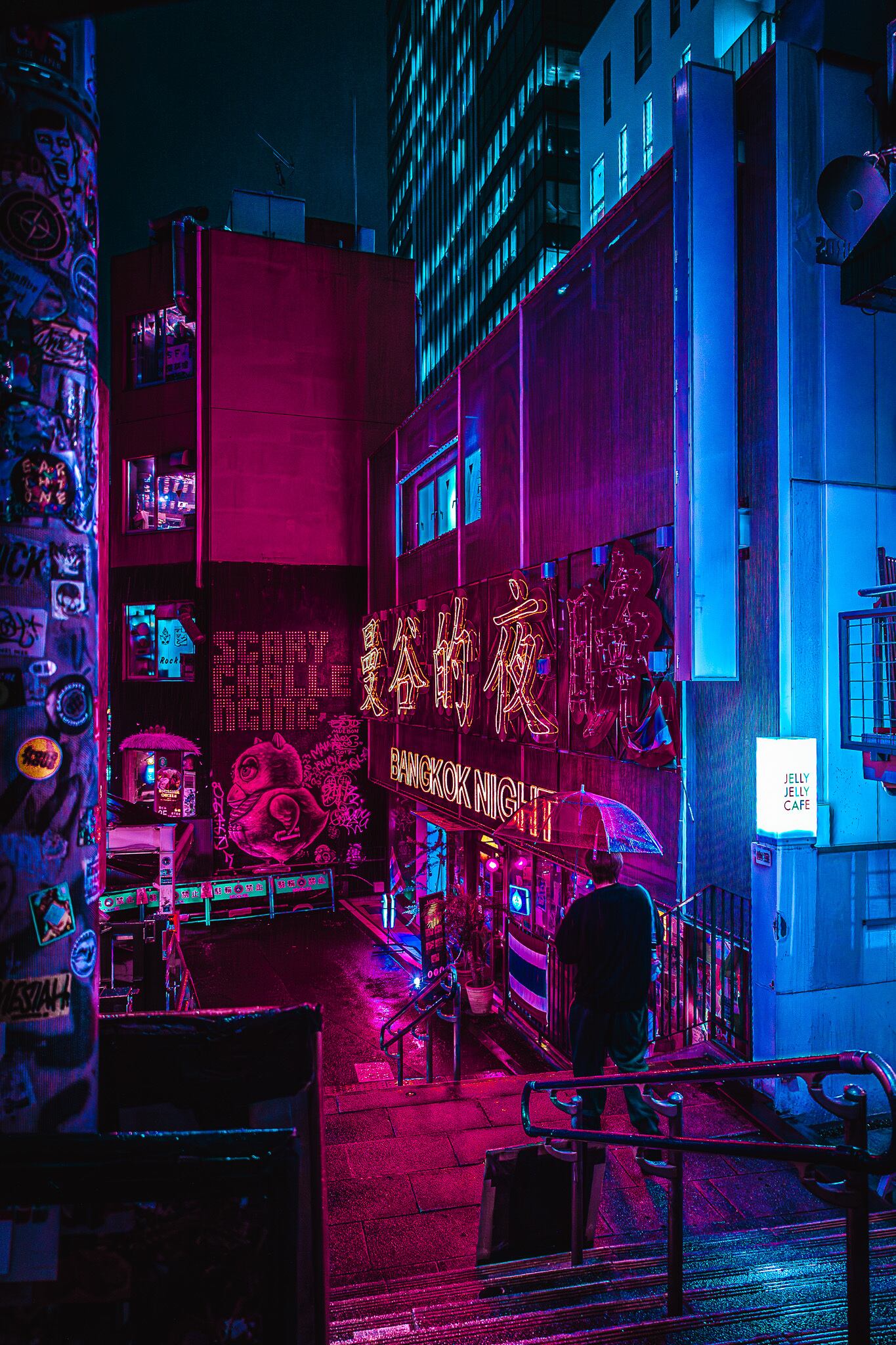 At the end of this stairway glows the sign “Bangkok Night”—