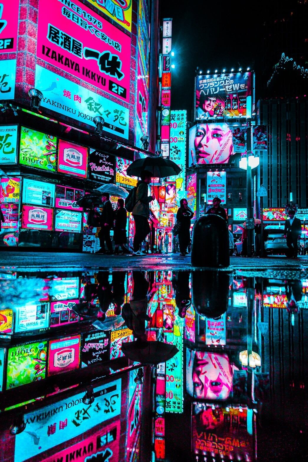 雨上がりの深夜、歩道の水たまりに映るネオンと人々を狙って撮影しました。