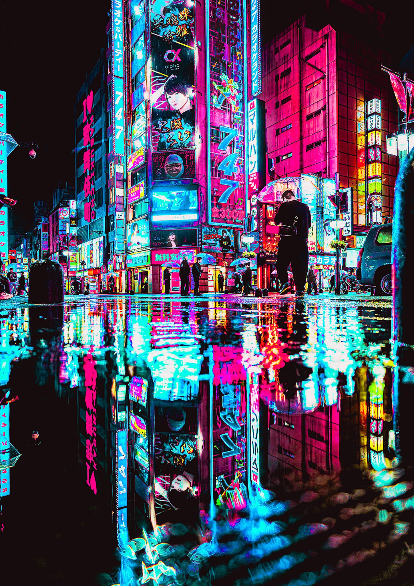 Rain, neon lights, a wet street, and a person passing by at just the right moment.