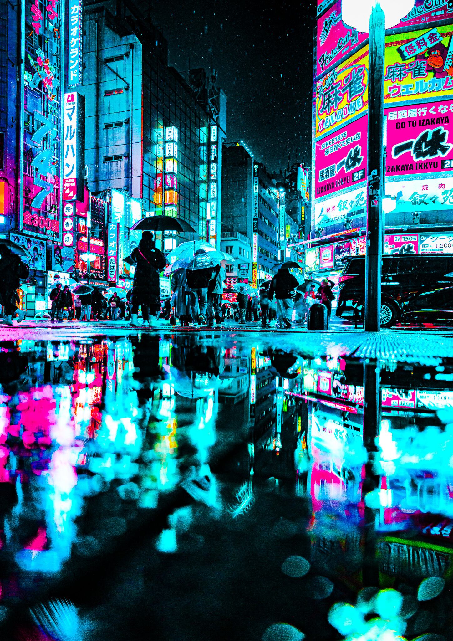 水たまりに映るネオンが、新宿の喧騒をもうひとつの世界に変える。