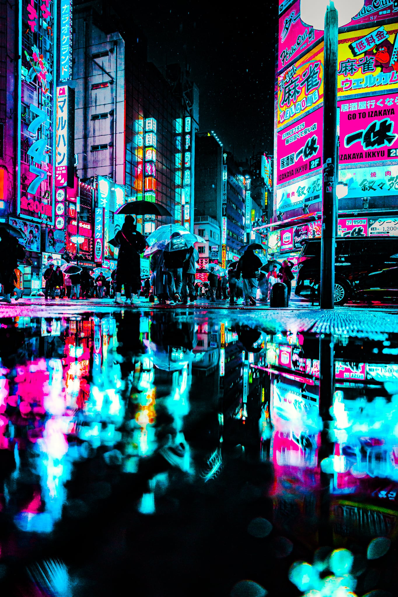 水たまりに映るネオンが、新宿の喧騒をもうひとつの世界に変える。